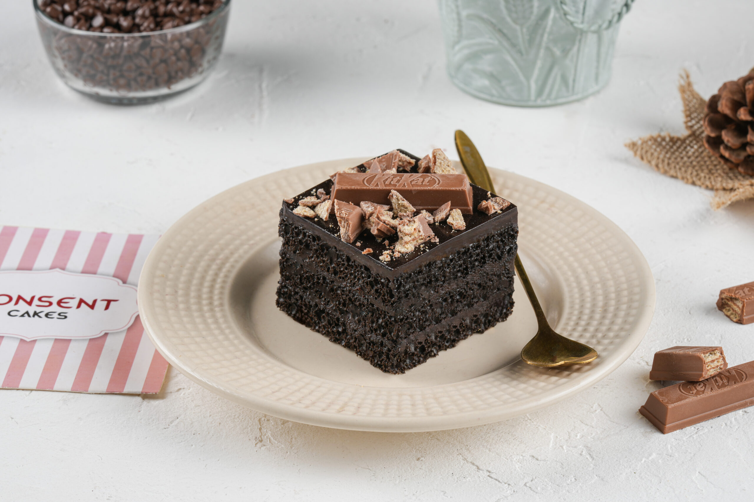 A delicious chocolate pastry layered with smooth cream and crunchy KitKat pieces.
